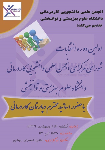انجمن علمی دانشجویی کاردرمانی دانشگاه علوم بهزیستی و توانبخشی اعلام کرد: اولین دوره انتخابات شورای مرکزی این انجمن علمی ، یکشنبه 17 اردیبهشت ماه جاری برگزار می شود.