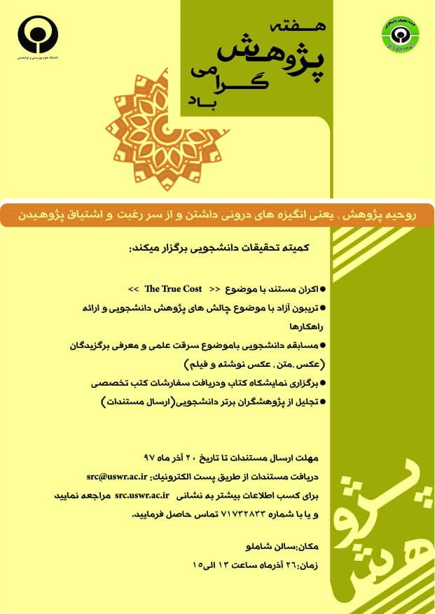 اخبار > کمیته تحقیقات دانشجویی دانشگاه، مراسم "هفته پژوهش" را با برنامه های متنوع و مشارکت همه دانشجویان برگزار می کند