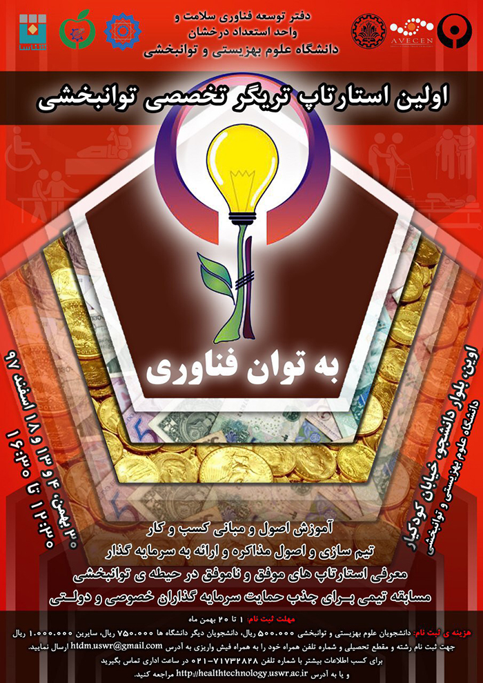 اولین استارتاپ تریگر تخصصی توانبخشی تحت عنوان " به توان فناوری "، از اواخر بهمن ماه سالجاری به همت مدیریت توسعه فناوری سلامت و واحد استعدادهای درخشان  دانشگاه علوم بهزیستی و توانبخشی، در این دانشگاه برگزار می شود.