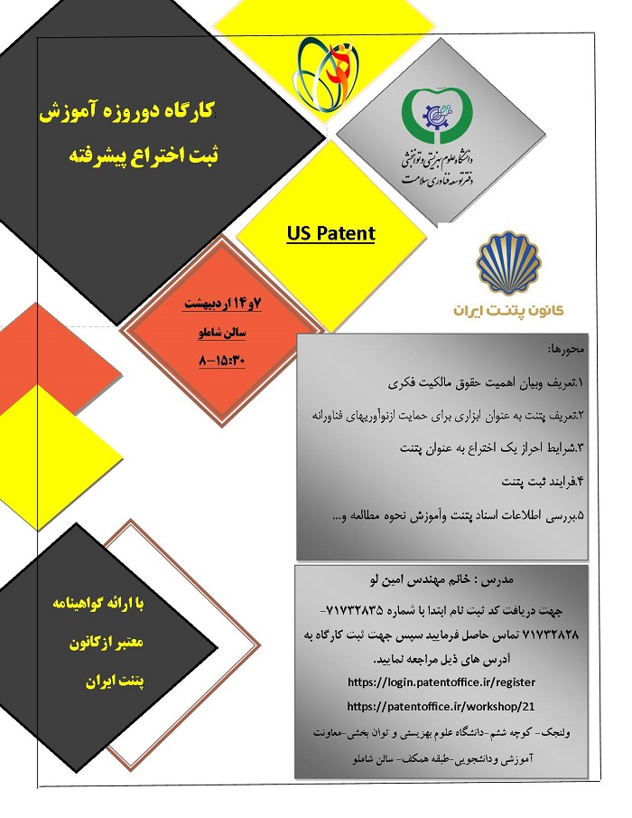 اولین کارگاه آموزشی " آموزش ثبت اختراع پیشرفته " و همچنین " ثبت اختراع بین المللی  us patent " از هفته آینده (روزهای 7 و 14 اردیبهشت ماه) به همت دفتر توسعه فناوری سلامت دانشگاه علوم بهزیستی و توانبخشی و با همکاری کانون پتنت ایران برگزار می شود.