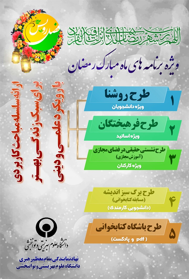 برنامه های دفتر نهاد مقام معظم رهبری در دانشگاه در قالب طرح " فصل رویش " در ماه مبارک رمضان و با استفاده از ظرفیت های مجازی برای تعامل با دانشگاهیان اجرا می شود.