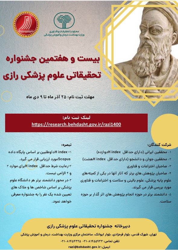 اخبار > فراخوان جشنواره کشوری تحقیقاتی علوم پزشکی رازی / فرصت ارسال آثار تا 9 دی ماه