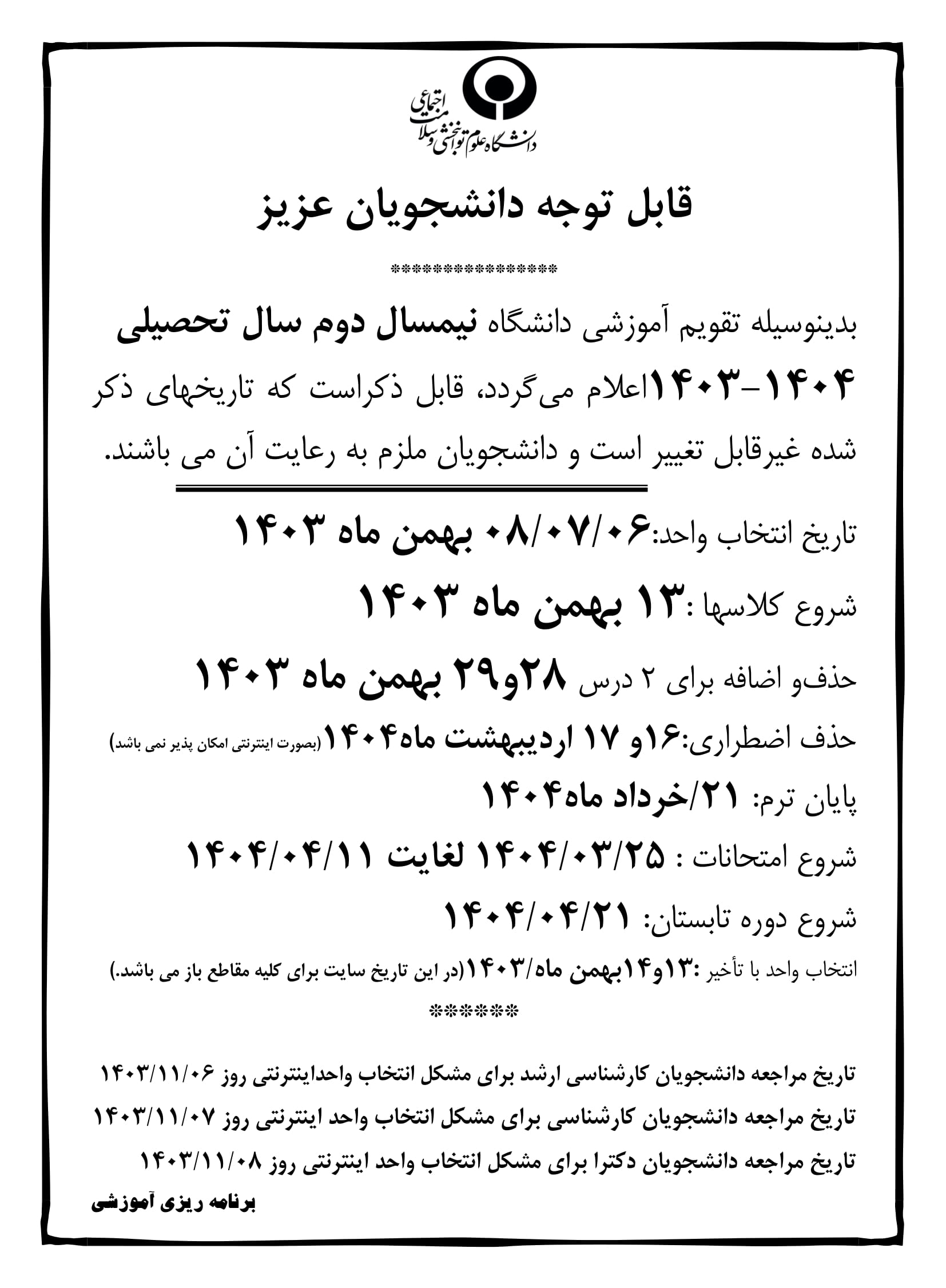 تقويم آموزشي نیمسال دوم سال تحصیلی 1403-1404