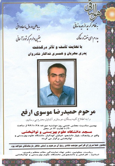 اخبار > برگزاری مراسم ختم فرزند سرکار خانم دکتر مداح ، در مسجد دانشگاه علوم بهزیستی و توانبخشی