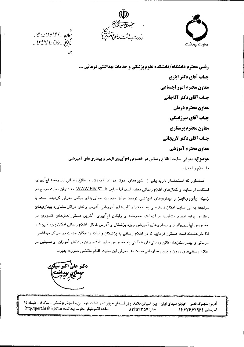 اخبار > معاونت بهداشت وزارت بهداشت، درمان و آموزش پزشکی اعلام کرد : معرفی سایت اطلاع رسانی در خصوص اچ آی وی / ایدز و بیماری های آمیزشی